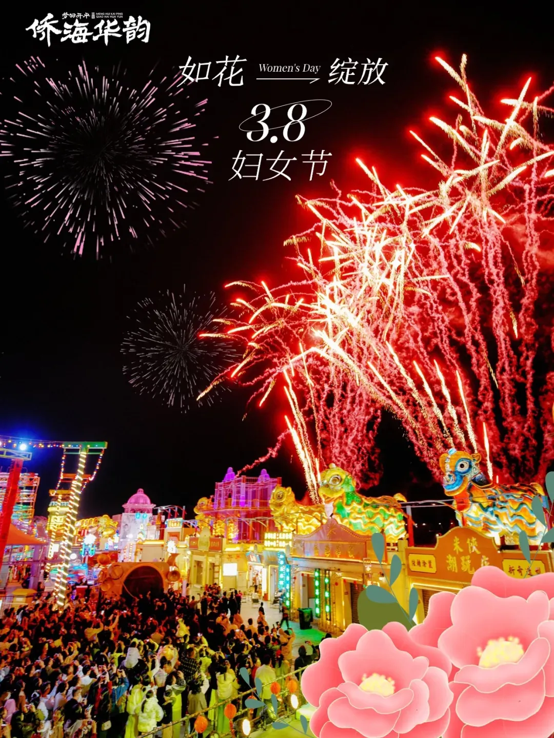 3月7日晚上9点,开平不夜城提前庆祝国际妇女节,烟花秀将准时启幕。届时,第一束烟花将划破夜空,各色烟花依次绽放,彩色花雨交相辉映,最后以巨型金辉点亮夜空。用这场精准编排的璀璨盛宴,提前预祝所有女性妇女节快乐!